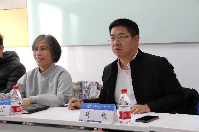 宇航学院党委书记徐亚军致欢迎词并从建校建院背景、人才培养特色、师资力量、党的建设等方面简要介绍学院情况;宇航学院党委副书记赵青介绍了全国党建工作“标杆院系”建设情况。国科大工学人工智能学院党委书记肖俊教授介绍了学院科研方向、专业领域、师生规模等情况。随后,两院党委同志重点针对“标杆院系”建设和“样板支部”建设工作展开交流,分享了党建特色工作中的具体经验和做法。