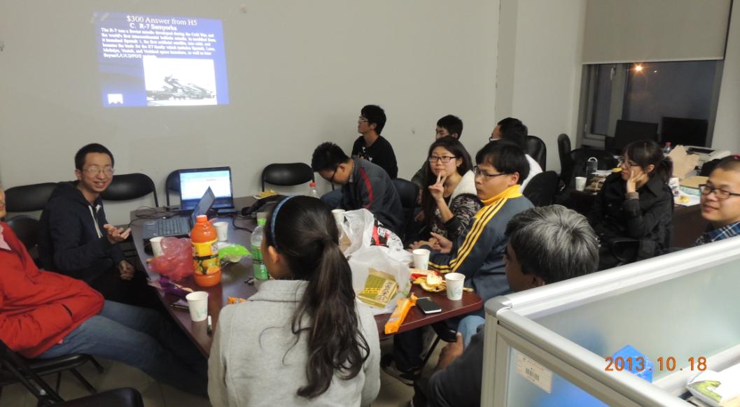 参加英语沙龙的有学术部李鹏、叶汉玉、来自巴基斯坦的留学生Ali以及宇航学院研一新生。晚七时整,在同学们逐一做了简短的自我介绍后,在整个会场轻松融洽的氛围中,主持人叶汉玉将与会的分成3个小组,每个小组5人左右。之后,3个小组开始了回答PPT上面的英文问题,整场比赛,你追我赶异常激烈。经过激烈的角逐之后,第二组以对七错一的成绩获得获得冠军,外国留学生加入的第一组以答对五道题的成绩获得亚军,第三组以答对四道题的成绩获得季军。