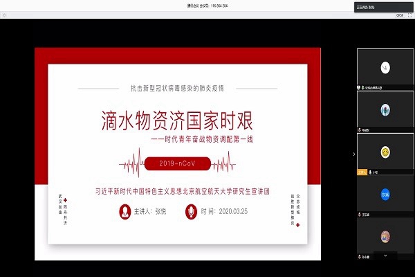 2020年3月25日下午,宇航学院硕士ZY19153班团支部组织开展学习日活动。本次学习日活动围绕“同心抗疫北航担当”的主题,邀请到了北京欧美大片ppt免费大全第五期研究生宣讲团的张悦同学作为嘉宾,给我们分享了她在本次全民抗疫总体战里的特殊经历。本次学习日活动应到23人,实到23人,每一位同学都积极参与其中。