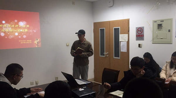 本次学习交流会主要分为两个部分:(1)SY16153支部的韩永蔚同志和ZY17151支部的刘振宇同志分别做报告讲述自己对十九大精神的认识;(2)两个支部的全体同志就韩永蔚、刘振宇同志的报告展开讨论。